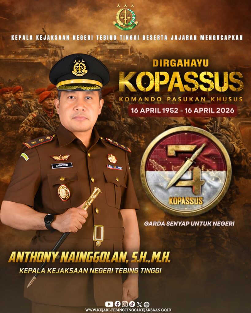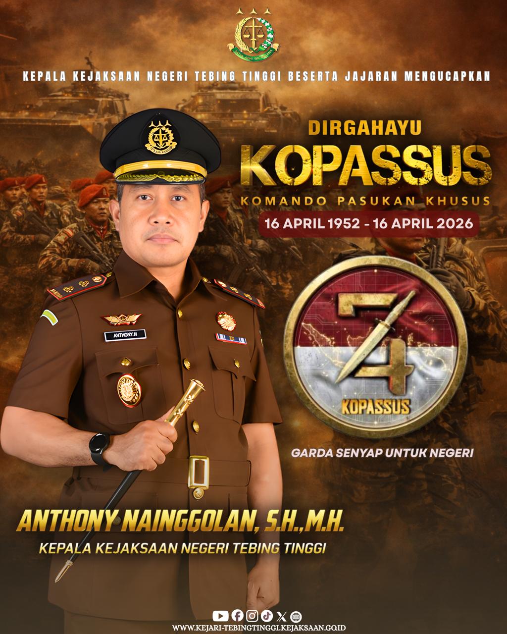 Kepala Kejaksaan Negeri Tebing Tinggi, Bapak Anthony Nainggolan, S.H., M.H., beserta seluruh jajaran mengucapkan: Dirgahayu ke-74 Komando Pasukan Khusus (KOPASSUS), 16 April 2026