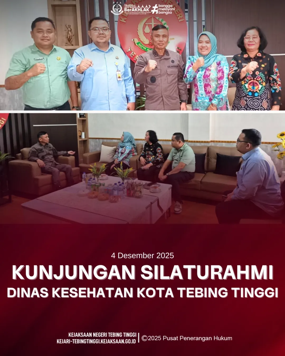 Kamis, 04 Desember 2025 bertempat di Kantor Kejaksaan Negeri Tebing Tinggi, Kepala Kejaksaan Negeri Tebing Tinggi Bapak Satria Abdi, S.H., M.H menerima langsung kunjungan silaturahmi dari Dinas Kesehatan Kota Tebing Tinggi. Kegiatan silaturahmi ini bertujuan mempererat hubungan kelembagaan dan meningkatkan sinergi