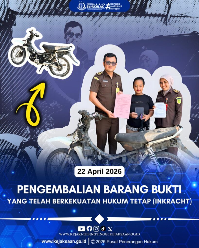 Rabu, 22 April 2026, bertempat di Kejaksaan Negeri Tebing Tinggi, melalui Bidang Pemulihan Aset dan Pengelolaan Barang Bukti (PAPBB) melaksanakan kegiatan pengembalian barang bukti perkara atas nama Terdakwa SD berdasarkan putusan yang telah berkekuatan hukum tetap (inkracht).