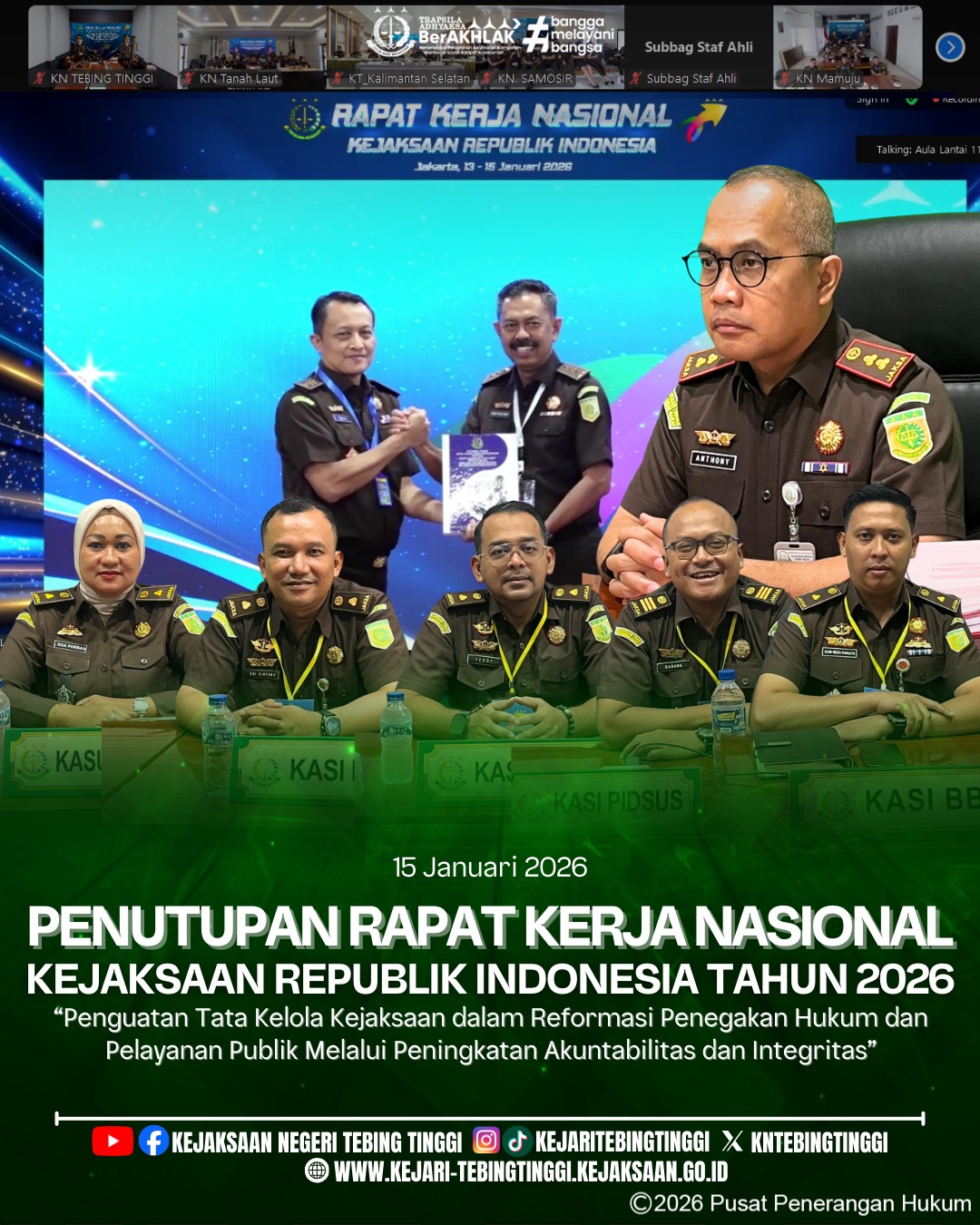 Kamis, 15 Januari 2026, bertempat di Ruang Vicon Kejaksaan Negeri Tebing Tinggi, Kepala Kejaksaan Negeri Tebing Tinggi, Bapak Anthony Nainggolan, S.H., M.H., beserta Kasubagbin dan Para Kasi Kejaksaan Negeri Tebing Tinggi mengikuti Penutupan Rapat Kerja Nasional (Rakernas) Kejaksaan RI Tahun 2026 secara daring.