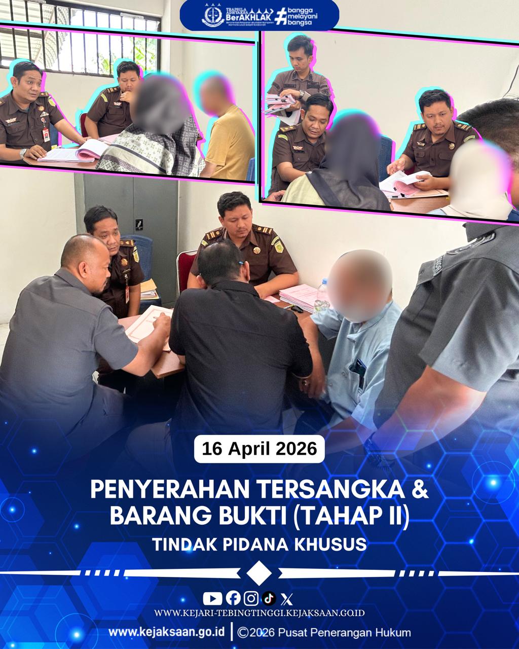 Kamis, 16 April 2026 Kejaksaan Negeri Tebing Tinggi melalui bidang Tindak Pidana Khusus telah melaksanakan Tahap II Perkara Tindak Pidana Korupsi pada perkara Penggunaaan Dana BOS SMK Swasta Kesehatan Ganda Husada Tebing Tinggi yang mengakibatkan kerugian keuangan negera tahun 2019 sebesar Rp 215.506.823,00 (dua ratus lima belas juta lima ratus enam ribu delapan ratus dua puluh tiga rupiah, Tahun 2020 sebesar Rp 183.173.417,00; (seratus delapan puluh tiga juta seratus tujuh puluh tiga ribu empat ratus tujuh belas rupiah) dan Tahun 2021 sebesar Rp 114.450.000,00 (seratus empat belas juta empat ratus lima puluh ribu rupiah dengan total kerugian keuangan Negara sebesar Rp 513.130.240,00 (lima ratus tiga belas juta serratus tiga puluh ribu dua ratus empat puluh rupiah) sesuai dengan Laporan Hasil Audit PKKN BPKP Perwakilan Provinsi Sumatra Utara Nomor : PE.04.03/LHP-389/PW02/5.1/2025 tanggal 14 Oktober 2025 atas nama tersangka NS, W, DS, FS, dan MEK.