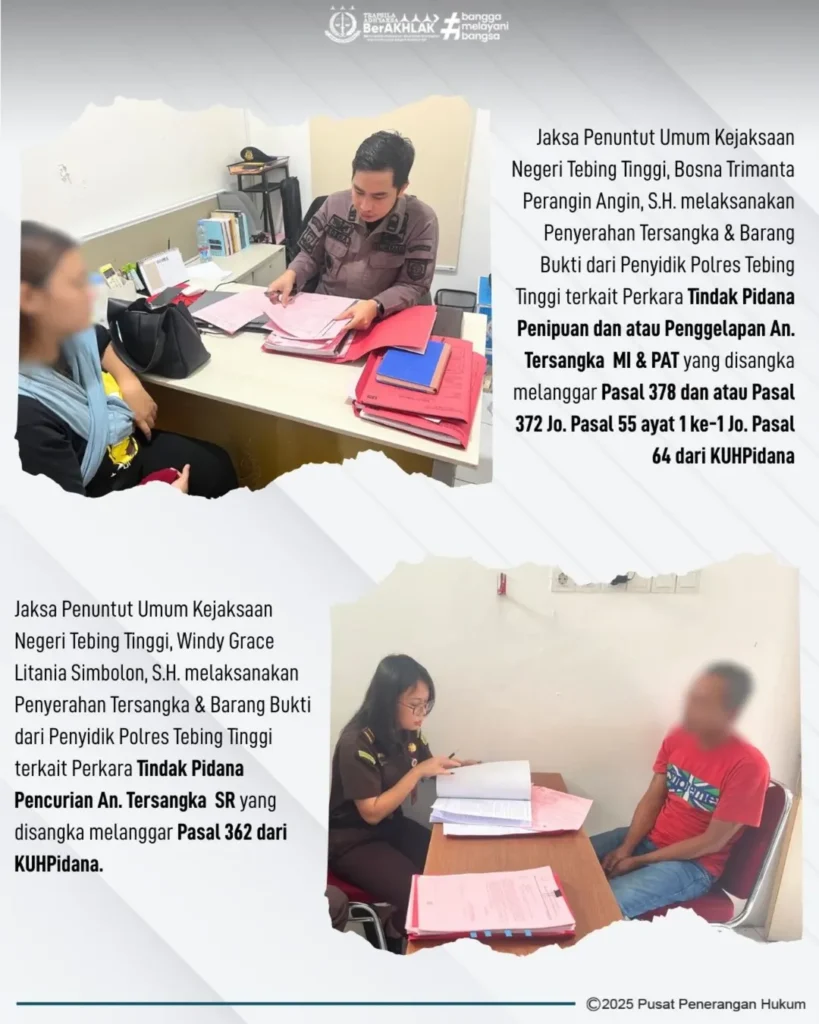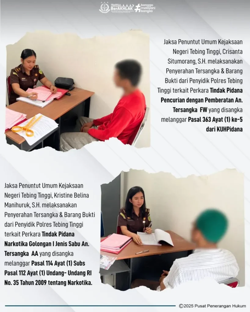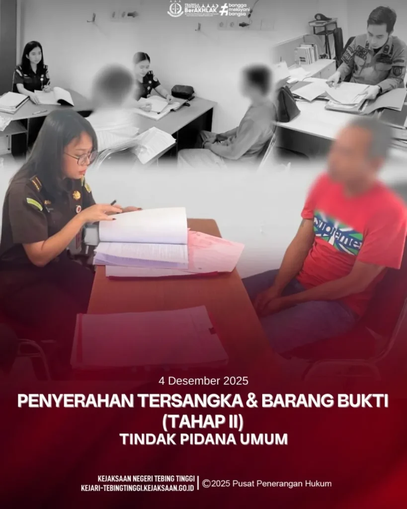 Kamis, 4 Desember 2025 bertempat di Ruang Tahap II Kantor Kejaksaan Negeri Tebing Tinggi telah dilaksanakan Penyerahan Tersangka dan Barang Bukti (Tahap II) Tindak Pidana Umum dari Penyidik Polres Tebing Tinggi ke Jaksa Penuntut Umum Kejaksaan Negeri Tebing Tinggi terhadap berkas Perkara Tindak Pidana sebagai berikut: