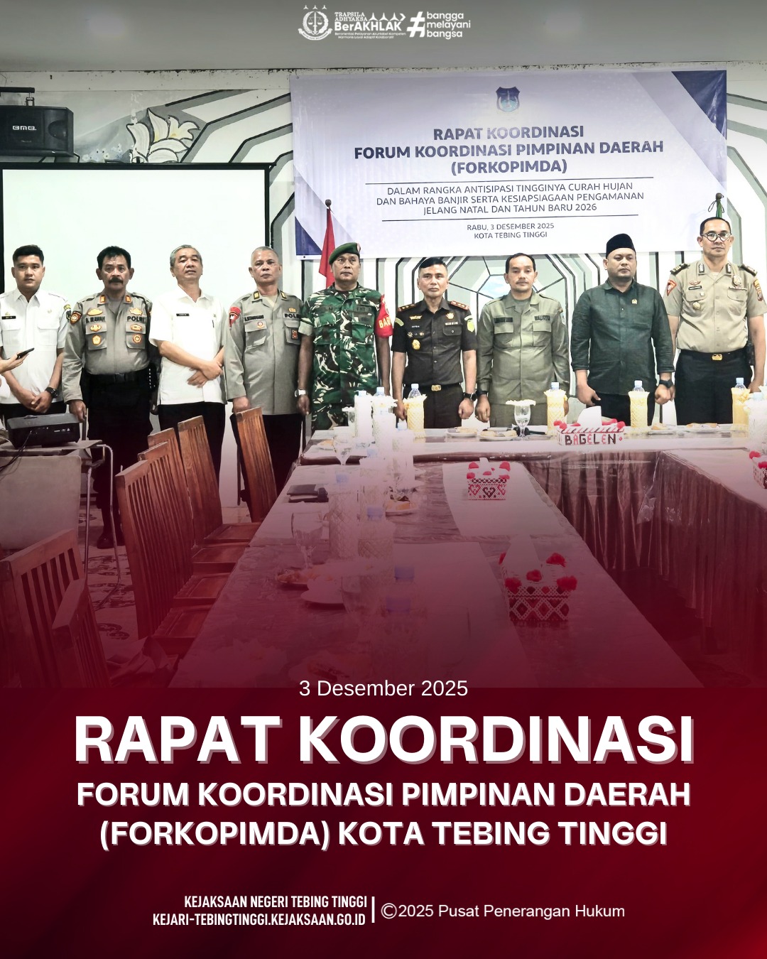 Bahwa Rapat Koordinasi Tim Forkopimda Kota Tebing Tinggi dilaksanakan dalam rangka pemantauan situasi, kondisi dan keamanan menyambut pelaksanaan Perayaan Natal dan Tahun Baru 2026.