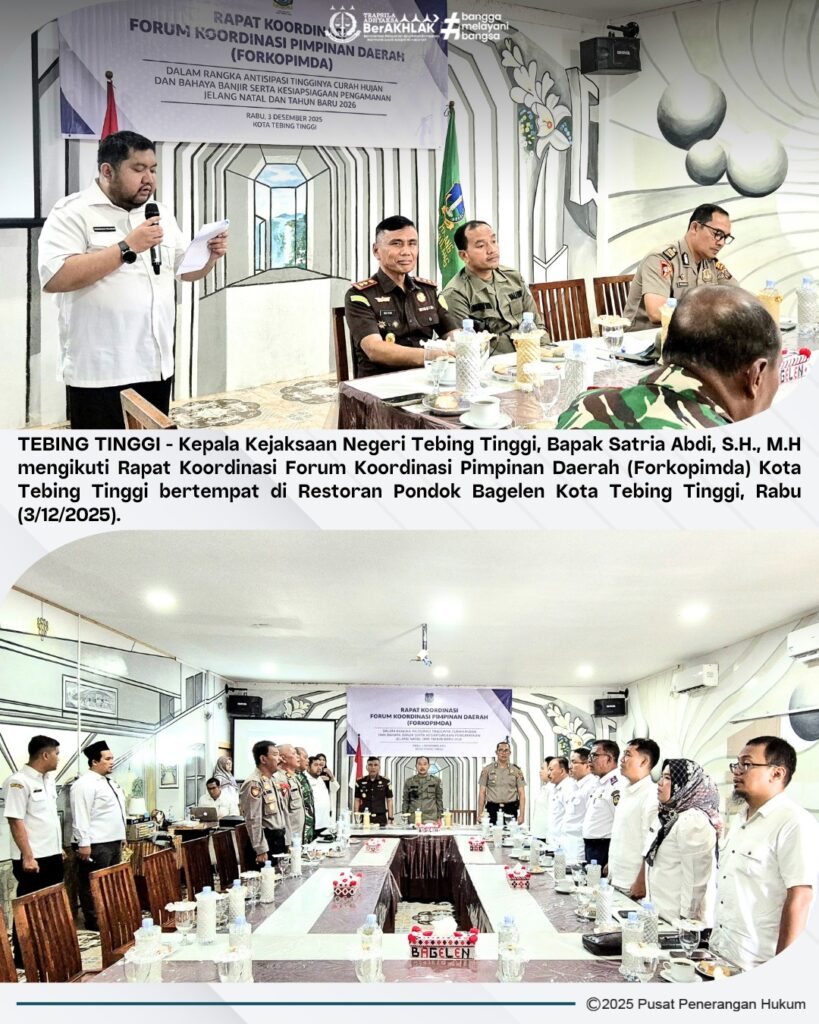 Rabu, 03 Desember 2025 Kepala Kejaksaan Negeri Tebing Tinggi, Bapak Satria Abdi, S.H., M.H mengikuti Rapat Koordinasi Forum Koordinasi Pimpinan Daerah (Forkopimda) Kota Tebing Tinggi bertempat di Restoran Pondok Bagelen Kota Tebing Tinggi.