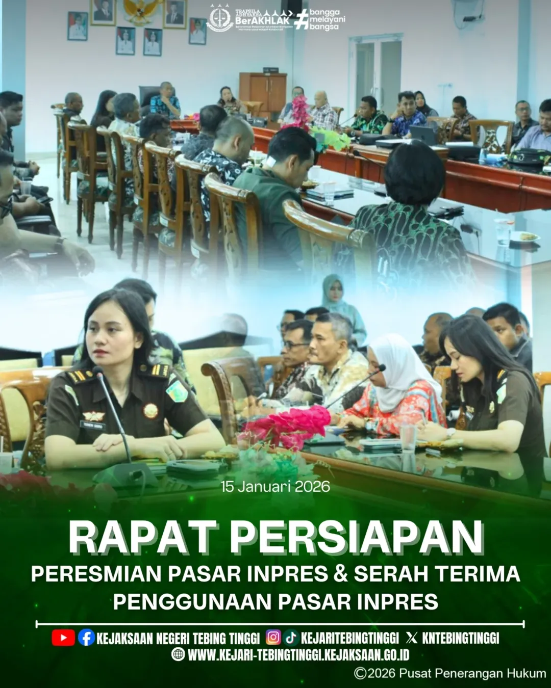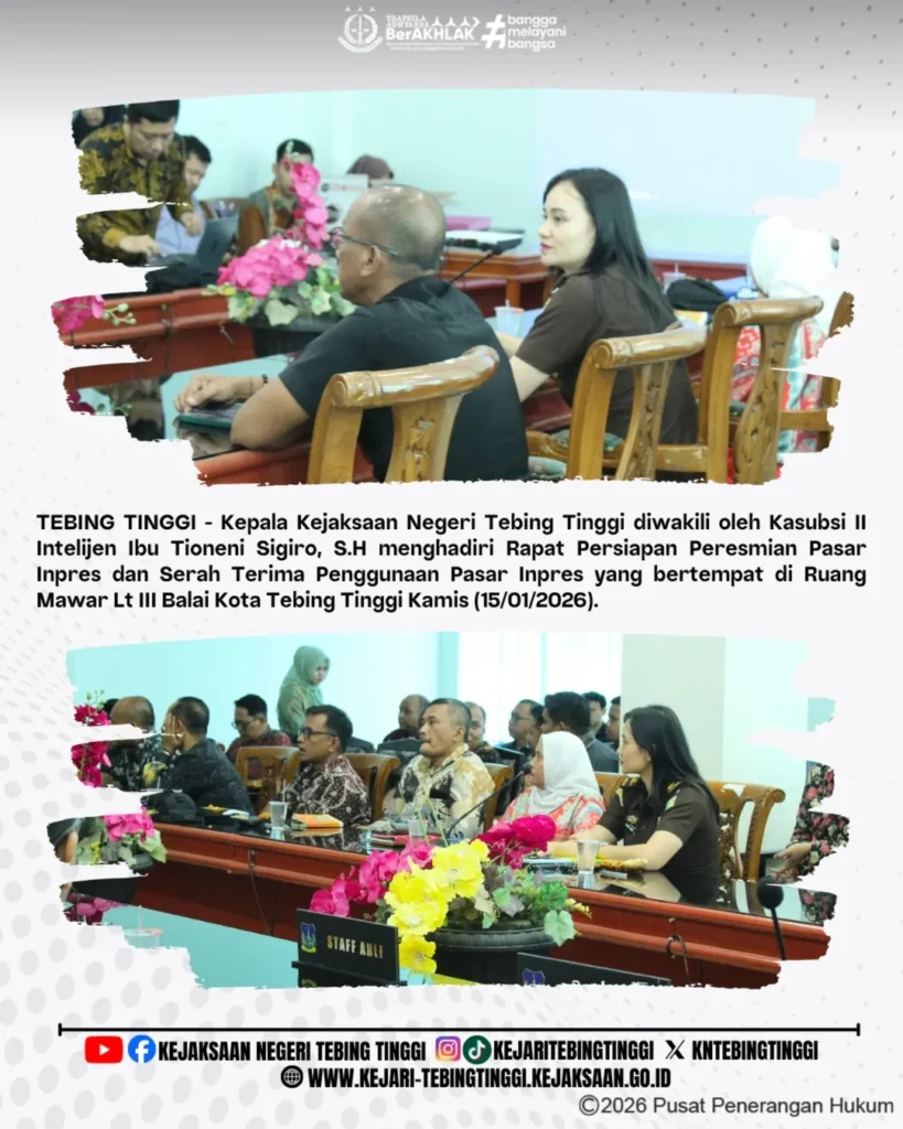 Kamis, 15 Januari 2026 Kepala Kejaksaan Negeri Tebing Tinggi diwakili oleh Kasubsi II Intelijen Ibu Tioneni Sigiro, S.H menghadiri Rapat Persiapan Peresmian Pasar Inpres dan Serah Terima Penggunaan Pasar Inpres yang bertempat di Ruang Mawar Lt III Balai Kota Tebing Tinggi