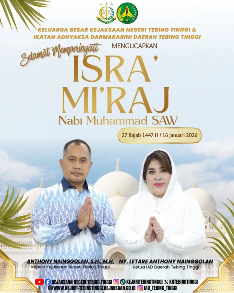 Keluarga Besar Kejaksaan Negeri Tebing Tinggi dan Ikatan Adhyaksa Dharmakarini Daerah Tebing Tinggi mengucapkan Selamat memperingati Isra Miraj Nabi Muhammad SAW 1447 H. Semoga kita selalu meneladani akhlak mulia Rasulullah.